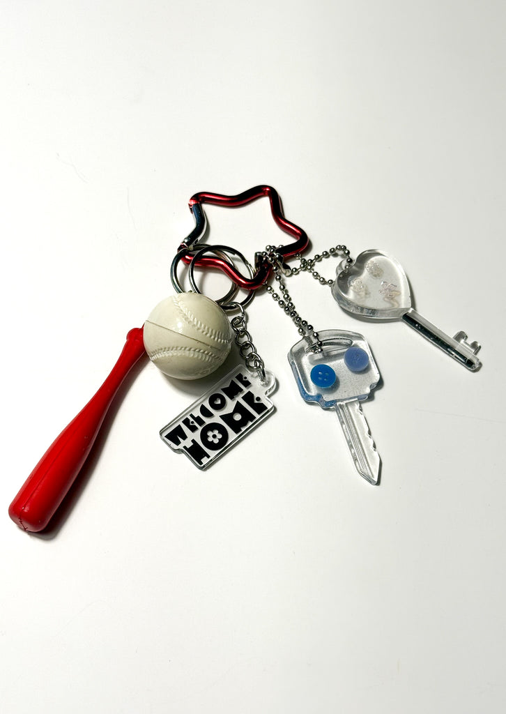 Red star-shaped carabiner featuring a baseball bat charm with matching ball, two clear handmade resin key charms with blue button accents, and “Welcome Home” tag in black and white.