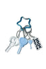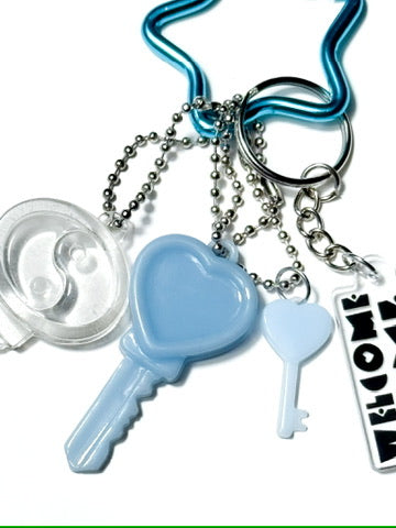 Blue star-shaped carabiner featuring three resin key charms in clear yin-yang shape, and pastel blue mini + regular heart designs, and a “Welcome Home” tag in black and white.